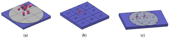 The figure visualizes the sensor’s limited range within grid cells. (a) Confined sensor range (V1 to V8) encircling the robot. (b) Eight cells surrounding the robot, with cell 9 denoting the robot’s position. (c) Robot moving from right to left; sensor range does not cover cost values of V3, V4, and V5.