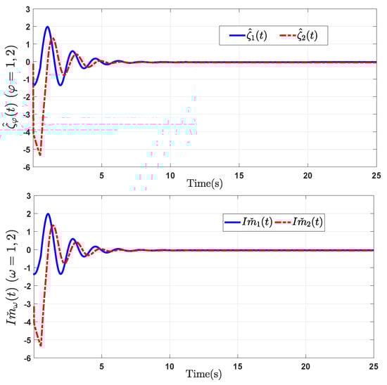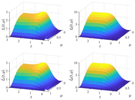 By utilizing Theorem 4, we are able to ascertain that system (13) is globally Mittag–Leffler stable. The stable behavior of the states is shown in Figure 4.