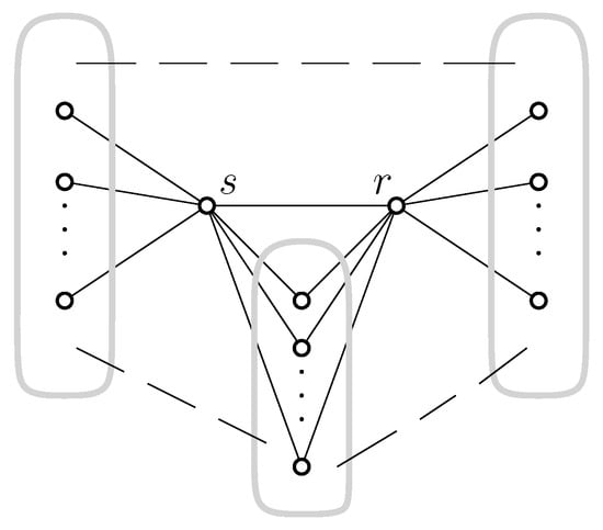 Let be the number of those neighbors of r that are neither adjacent to s nor equal to s; see Figure 1. Let be the number of those neighbors of s that are neither adjacent to r nor equal to r. Then, and . Note that and . Thus,