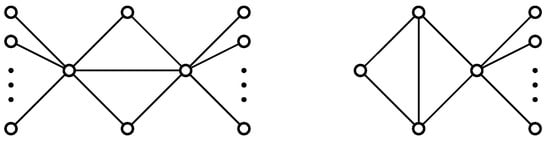 For , denote by the n-order bicyclic graph shown in Figure 3, where with and . Also, for , denote by the n-order bicyclic graph shown in Figure 4, where with and for every .