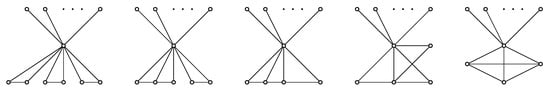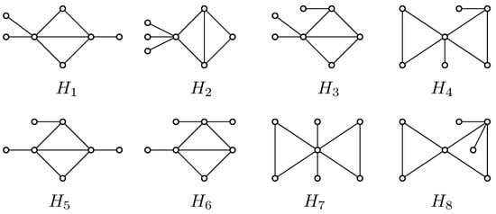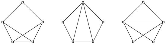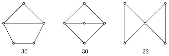If , then the desired conclusion follows from Theorem 9. If , then by Lemma 11 the minimum degree of a graph possessing the highest value of in the set of all n-order connected tricyclic graphs must be at least 2. If , then there are only three n-order connected tricyclic graphs with a minimum degree at least 2; Figure 10 shows all these three graphs, and its caption gives the values of for the mentioned three graphs. Now, in the following, assume that .