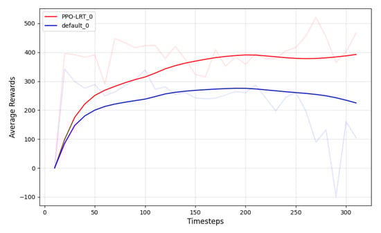 The average reward values during the training process are shown in Figure 5. The light-colored reward value curve represents the raw data, displaying a more accurate portrayal of the reward fluctuations, while the smoother reward value curve offers a clearer view of the average reward value’s increasing trend. The red curve corresponds to the reward values of the PPO-LRT algorithm, and the blue curve corresponds to the reward values of the default scheduling algorithm used by the Kube scheduler for the same scheduling training.