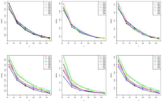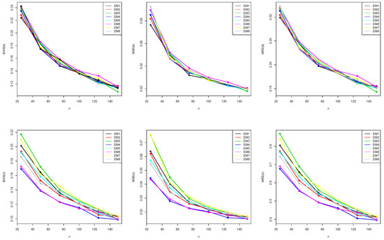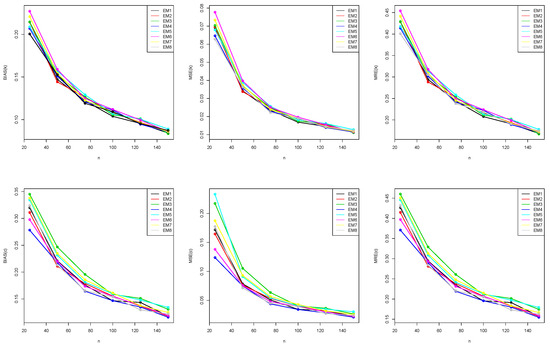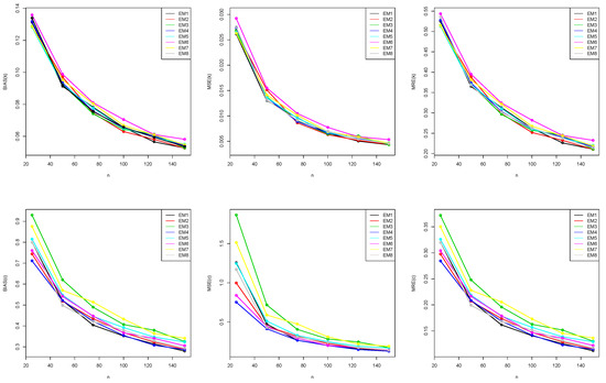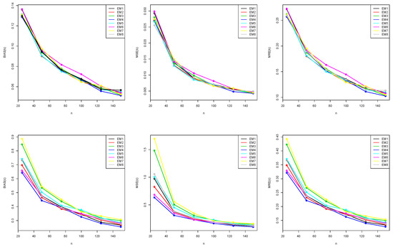 Table A1, Table A2, Table A3, Table A4 and Table A5 in Appendix A show the results of our simulation. We also display the values from these tables in Figure 2, Figure 3, Figure 4, Figure 5 and Figure 6. Figure 2, Figure 3, Figure 4, Figure 5 and Figure 6 show the performance outcomes for the eight different estimation methods; from these figures, we can generally see that, as the sample size increased, the measure decreased. The power of any value has been shown to be proportional to its position with respect to all of the estimating approaches. Table A6 shows our estimators’ partial and total ranks.