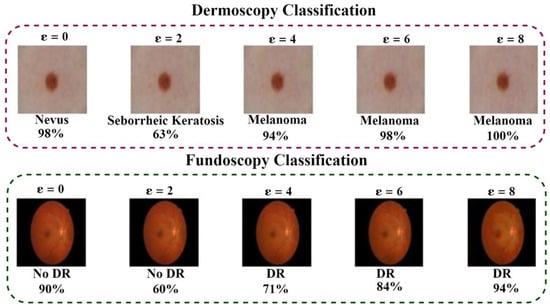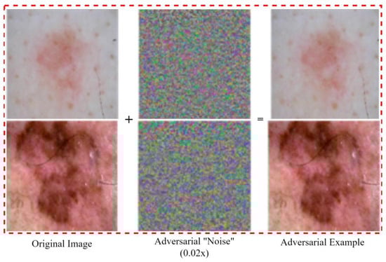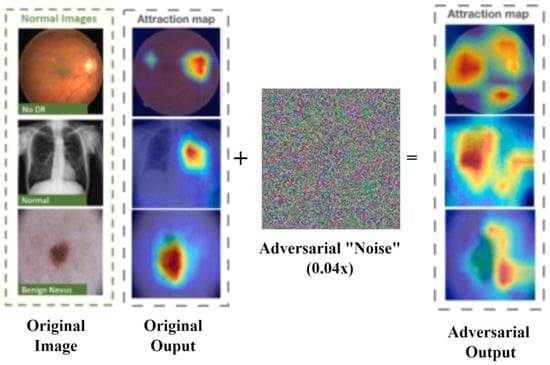 Deep neural networks (DNNs) have achieved remarkable success in natural image-processing tasks. The field of medical image analysis is not left out [1,2,3], including skin lesion diagnosis [4], diabetic retinopathy detection, and tumor segmentation [5,6]. Notably, an AI-based diabetic retinopathy detection system [7,8] has been approved by the Food and Drug Administration (FDA) of the United States [9]. In addition to enhancing efficiency and patient outcomes, medical diagnosis models driven by deep learning can reduce clinical costs. Nevertheless, despite its promise, deep learning is vulnerable to adversarial attacks [10,11], which can severely disrupt DNNs (Figure 1). These adversarial attacks can be generated by introducing imperceptible perturbations into legitimate samples, making them difficult to detect manually. Adversarial vulnerability poses a significant challenge for the application of DNNs in safety-critical scenarios such as medical image analysis [12,13,14], as it can result in misdiagnosis, insurance fraud, and a loss of confidence in AI-based medical technology.