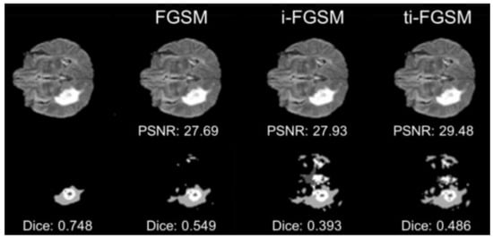 where the largely depends on the actual task (segmentation, detection, or classification). Equation (2) can be integrated using Newton-like approaches [14,41] or algorithms based on gradient descent. Other white-box adversarial attack techniques include the Limited-memory BFGS method [14], the Fast Gradient Sign Method (FGSM) [42], etc. There are also additional threat models, such as the black-box attack, which in real-life situations presents a bigger security risk to computer-aided diagnostic models [12,43].