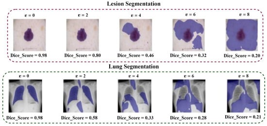 - Park, H.; Bayat, A.; Sabokrou, M.; Kirschke, J.S.; Menze, B.H. Robustification of Segmentation Models Against Adversarial Perturbations in Medical Imaging. In Predictive Intelligence in Medicine: Third International Workshop, PRIME 2020, Held in Conjunction with MICCAI 2020, Lima, Peru, 8 October 2020, Proceedings 3; Springer Nature: Cham, Switzerland, 2020; Volume 12329, pp. 46–57. [Google Scholar] [CrossRef]