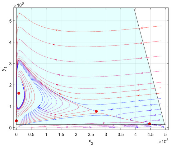 and are saddles, is a stable node, and is a stable focus. The conditions of competitiveness, dissipativity, and conditions of Theorem 8 are not satisfied. A phase portrait of the system is presented in Figure 1.