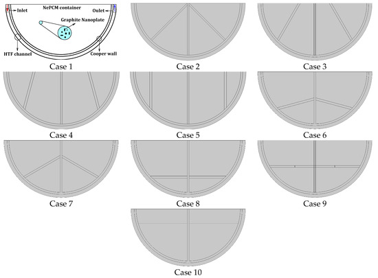Figure 1 depicts various configurations of the LHTES system containing the NePCM. As shown, warm water with a temperature enters the semicircular channel and transfers a portion of its thermal energy to the solid NePCM via the copper separators. Consequently, the NePCM undergoes a phase change from solid to liquid as it absorbs thermal energy from the warm water. It is important to highlight that in each configuration, the total volume of the fins remains constant. This implies that as the length of the fins changes from one case to another, the thickness of the fins also varies accordingly. This ensures that the overall volume occupied by the fins remains constant throughout the different configurations. Additionally, it should be noted that the vertical fin (middle fin) remains unaltered in cases 2 through to 10. The additives, which are uniformly mixed with the base medium (pure 1-Tetradecanol), include nanosized graphite plates. Table 1 and Table 2 provide detailed specifications of the materials involved in the LHTES unit. These tables outline the specific characteristics and properties of the various materials utilized within the system, providing valuable information about their composition, thermal conductivity, phase change temperatures, and other relevant parameters.