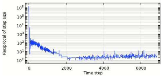 Based on the enthalpy–porosity approach, the NePCM region is modeled by taking into consideration the modified energy and momentum source terms. In the analysis, we treat the phase transition zone as a porous medium, representing it as a mushy zone with porosity defined by the liquid fraction . Through the mushy zone, a high-velocity gradient is developed since both solid and liquid NePCMs coexist. Moreover, a slight difference between the solidification and melting temperatures is considered (). The non-linear governing equations are solved using the finite element approach within version 5.6 of the COMSOL Multiphysics computational fluid dynamics module [29]. Since the problem is transient, one of the best implicit methods is employed, which is the free step backward differentiation formula. The coupled algebraic system is solved using the iterative parallel direct solver [30], coupled with the Newton method. The convergence plot is monitored, and the process continues until the residual error reaches 10−6. A damping factor of 0.8 is utilized in the iterative Newton approach to prevent divergence. Figure 2 shows a convergence plot of the coupled numerical solution.