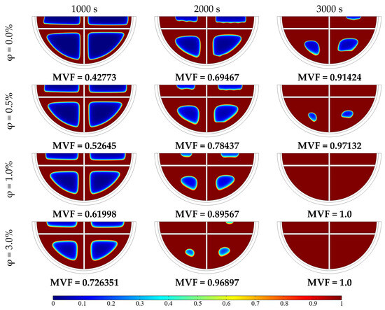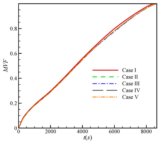 Recognizing the importance of the mesh density in ensuring the accuracy of numerical results, meticulous grid independence tests were conducted. To achieve this objective, the corresponding MVF for the five different mesh densities, as presented in Table 3, are compared to ensure that the accuracy of the iterative solution is maintained (see Figure 3). It can be noticed that all cases are consistent. However, a slight difference is seen for Case (I), when a relatively small grid size is considered. Consequently, Case (III) (7043 elements) is chosen to retain an acceptable accuracy while minimizing calculation cost as much as possible.