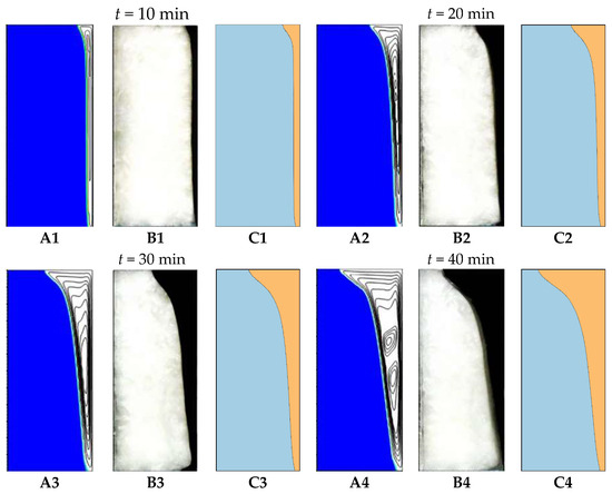 Comparison between the melting fields available in [31] and those obtained by the present study; (A1–A4): numerical results [31], (B1–B4): experimental results in [31], and (C1–C4): the present study.