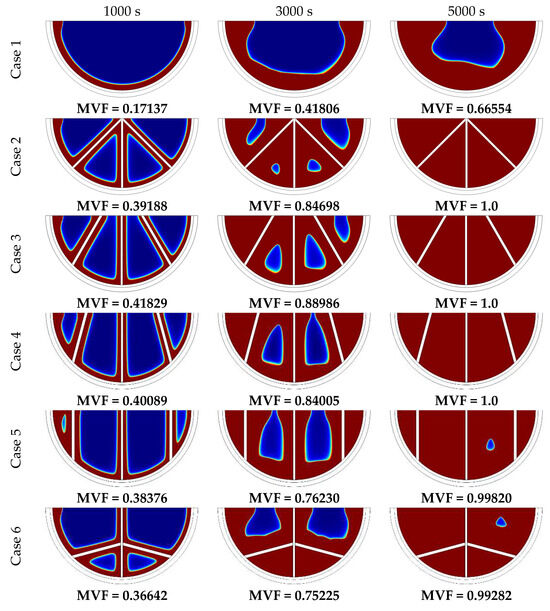 Using a symmetric fin configuration (Case 2) can significantly improve the melting process (compared with Case 1). However, the charging process in the portions in the vicinity of the insulated top wall is obviously lower than in the remaining portions (see the blue region in Figure 6 and the bulk red region in Figure 7, showing the not melted PCM). To address this issue, the variable fins in Cases 3, 4, and 5 were directly attached to the insulated wall to conduct heat from the copper wall to the PCM near the insulated wall. This strategy, as can be seen in Figure 6 and Figure 7, leads to a more significant segment on the left- and right-hand sides of the fixed fin, increasing the overall melting time of the whole storage.