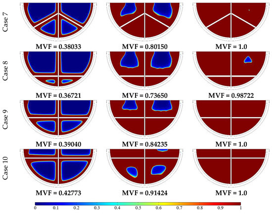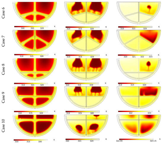 In Cases 6–10, the variable fins are attached to the fixed fin. The variable fins are inclined for Cases 6 and 7, while for Cases 8–10, they are attached horizontally to the fixed fin. The upper portion of the storage near the insulated wall remains unmelted. The attachment height has been changed for the last three cases. It is evident that by decreasing the distance between the variable fins and the insulated surface, according to Figure 7, the overall temperature of the PCM increases, leading a reduction in the amount of solid PCM, and an enhancement in the melting rate.