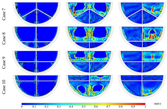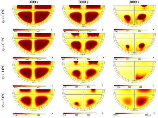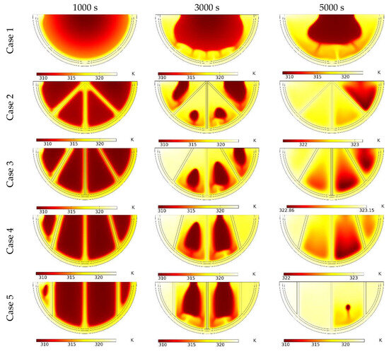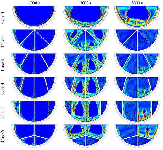 As shown in Figure 5, after 3000 s of charging, in most cases, the PCM near the horizontal wall remains unmelted, as the mentioned wall is adiabatic. In other words, the attachments of the other fin (in each quarter cylinder) can determine the charging time of the storage. The angle of the variable fins is changed from vertical (Case 5) to inclined (Cases 2, 3, 4, 6, and 7) and finally vertical (Cases 8, 9, and 10) to evaluate the role of the angle of the fin. According to Figure 6, the velocity magnitude at the initial stages of the charging is low, indicating that the conduction mode of the heat transfer mainly governs the charging process. This can also be understood from the temperature contours (Figure 7). The role of fin placement can be easily seen in Figure 7, as it elevates the temperature around it through conducting thermal energy to the PCM. With the progression of the charging, the convection mechanism increases, and the magnitude of velocity (Figure 6) and temperature (as per Figure 7) of the liquid PCM increases.