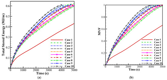 (a) Total energy stored and (b) liquid fraction for Cases 1–10.