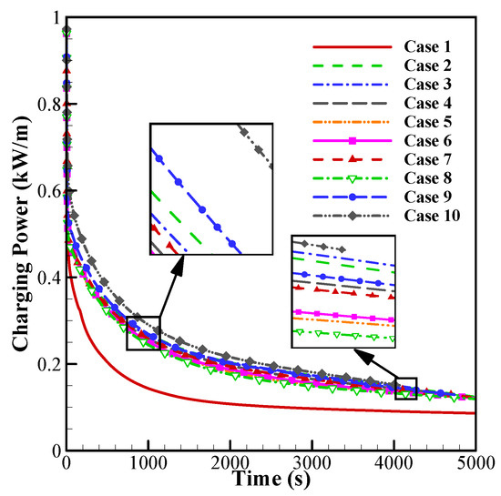 Figure 8a,b illustrate the time variation of the stored energy and the liquid fraction of the PCM during the charging process. Case 1 (without fin) has the lowest melting rate, and after 5000 s of charging, only 60% of the PCM in the storage is charged. Case 10 has the highest charging rate throughout the melting process. The variable fins in Case 10 are closer to the insulated wall, so a higher amount of heat is conducted to the PCM. Figure 9 depicts the detail of the different types of thermal energy stored in the PCM (either latent or sensible) and the fins (sensible). It is clear that the stored energy in the storage is mainly in the form of latent energy.