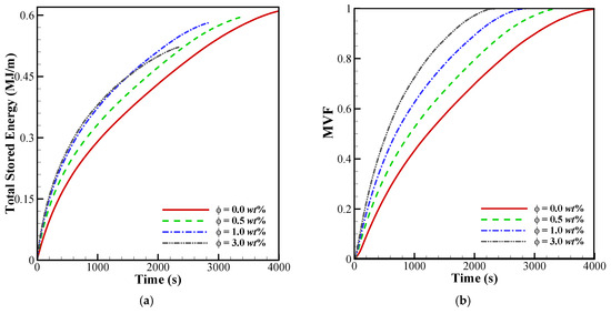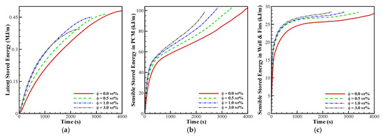 Figure 14 presents different forms of thermal energy in the storage. By increasing the GNP concentration, the sensible form of energy in the fins, wall, and the nano-PCM increases. Concerning the nano-enhanced PCM, this is plausible, as the energy stored in the nanoparticles is only sensible energy and increases as the mass fraction of the nanoparticles increases.