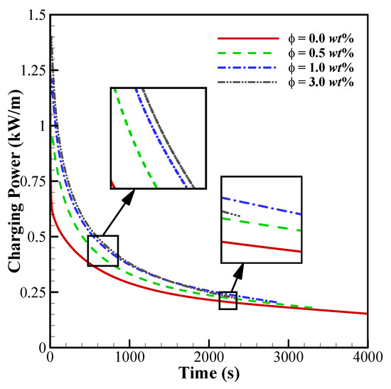 Figure 15 shows the instantaneous charging power of the cases enhanced with the GNP nanoparticle. As discussed before, the charging power increases by dispersing the GNP nanoparticles, meaning that the storage charges faster. Nonetheless, as can be seen, the instantaneous charging power of the storage (time-based charging power defined in [32]) may be non-monotonic and vary during the charging process. In other words, the storage’s full charging power is higher for script phi, of which . However, in terms of partial charging power, the charging power for the case of is slightly higher at the last stages of the charging process (the magnified area in Figure 15).