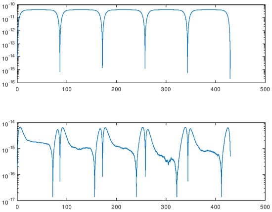 The error of computed Hamiltonian, , on , using the five-stage fourth-order method (top) and using the seven-stage fifth-order method (bottom).