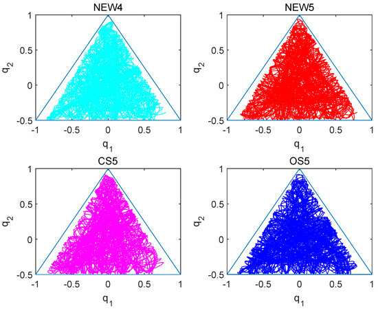 Figure 2 illustrates the trajectory plots derived from numerical simulations of the Hénon–Heiles system within the interval [0, 1000] using a step size of . All four methods display trajectories that are confined within the equilateral triangle area in this situation. Nonetheless, Figure 3 shows that when the OS5 [8] method is used to generate numerical trajectories within the interval [0, 17,575], the trajectories escape directly from the upper region. Figure 4 looks into the causes of the OS5 [8] method’s escape phenomena, attributing them to the numerical inability to maintain system energy. The capacity of symplectic algorithms to maintain correct numerical behavior over lengthy periods of time is a significant advantage. Therefore, we continue to increase the time interval. In Figure 5, it is evident that the NEW4, NEW5 and CS5 [10] methods maintain accurate numerical behavior even at t = 100,000.