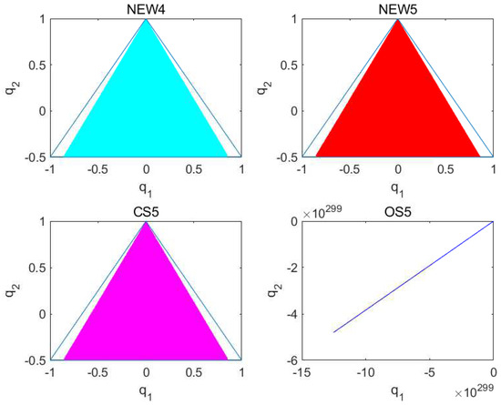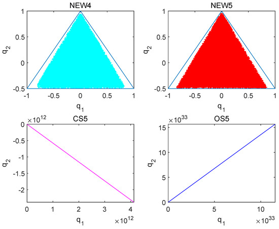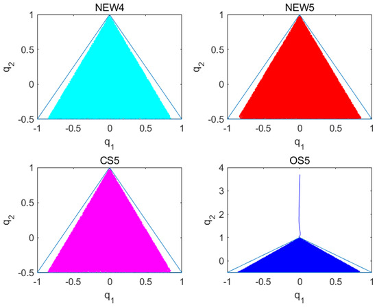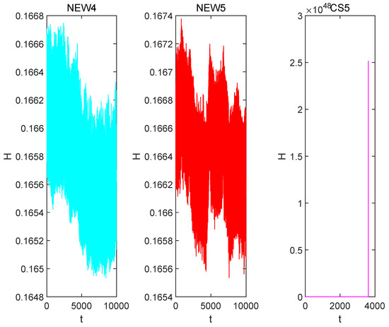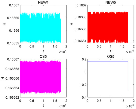 With such extensive time intervals, the need for further comparisons with bigger time intervals appears to be decreasing for the NEW4, NEW5 and CS5 [10] methods. As a result, the step size is steadily increased in the interval [0, 10,000], beginning with and gradually increasing until it reaches . The CS5 [10] method begins to gradually deviate from the triangular region at this point. However, the NEW4 and NEW5 methods continue to display reliable numerical performance in the face of such variances. These phenomena are illustrated in Figure 6. Finally, Figure 7 depicts the variation in Hamiltonian energy over time using the NEW4, NEW5 and CS5 [10] methods, emphasizing that the inability to maintain system energy is the cause of the escape phenomena.