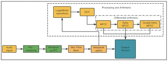 Subsequently, the Librosa library is used for the feature extraction of the Mel spectrum and MFCC. The system sets the frame length to 11.4 ms, frameshift to 1.42 ms, and 40 Mel bands. Although the MFCC conforms to the auditory perception characteristics of the human ear, the standard MFCC reflects the static characteristics brought about by voice data. In comparison, the human ear is more sensitive to the dynamic characteristics of speech. Therefore, the introduction of the MFCC’s first-order difference (Formula (1)) and second-order difference (Formula (2)) can better extract the dynamic characteristics of speech to improve classification accuracy [21]. Therefore, first, the row information of the Mel spectrum and MFCC are scalarized into the basic features of bird sound, and then their first- and second-order differential coefficients are scalarized to obtain their dynamic characteristics. Then, these four types of features are combined into bird sound feature vectors (denoted by Formula (3)). Finally, a total of 148,021 samples were obtained. The data preprocessing process is shown in Figure 1.