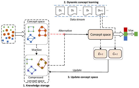 Concept-cognitive learning (CCL) [22] originated from formal concept analysis and learning and was formed through the intersection of formal concept analysis, machine learning, granular computing, and dynamic learning, involving incremental concept learning and dynamic knowledge processing in dynamic environments. A very important and obvious feature of concept-cognitive learning is dynamic [22]. A concept-cognitive learning model was first proposed for dynamic data in [23]; this could integrate the contributions of new data to concept learning into the model in a dynamic environment for incremental learning. Subsequently, to solve different problems, a relevant series of models has been proposed. For example, to accelerate concept learning performance, a new C3LM model for concurrent computing is proposed in [24]. In order to adapt to dynamic data stream mining, a concept-cognitive computing system (C3S) is proposed in [18]. In this paper, our work mainly refers to the idea of the C3S model in [18]. Its author has released a Java version of the model (https://github.com/YunlongMi/streamC3S_release (accessed on 20 May 2023)), but for the application and research of machine learning, Python is more popular with researchers, so we have developed the Python version of the C3S model, named PyC3S. Because people can usually dynamically and quickly complete concept learning (CL) from different types of data, this study simulates human cognitive processes for learning, effectively storing and utilizing early acquired knowledge, and naturally integrating the contributions of new data to concept cognition into later concept learning. Unlike most stream learning methods and incremental learning algorithms based on data feature space, PyC3S is designed based on concept space, which is a structured knowledge representation topology. As shown in Figure 2, this model consists of three parts: knowledge storage, dynamic concept learning, and concept space update. In addition, PyC3S also has efficient computing power and can accurately complete classification tasks in a short time.