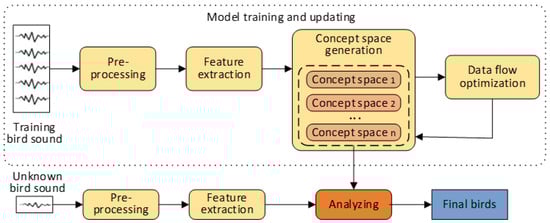 Generally speaking, a deep learning model requires large sample datasets for training, making it difficult to adapt to rapidly changing dynamic data stream learning, and the models do not have scalability and rotational invariance. Especially in high-dimensional dynamic datasets, the resource cost of model training will be greater, which also seriously hinders its large-scale application. Bird song classification and recognition is a high-dimensional dynamic process, so deep learning needs to be further tested in the application of bird song classification tasks. In addition, the interpretability of the deep learning model is poor. At the same time, there are fundamental differences between deep learning models and the way humans think and learn. In other words, deep learning models lack the common sense to conclude cross-domain border areas. The concept-cognitive computing (CCC) method [18] simulates the learning process of humans, who not only learn from personal experience but also integrate known concepts to represent things they have never experienced before, learning in natural increments.