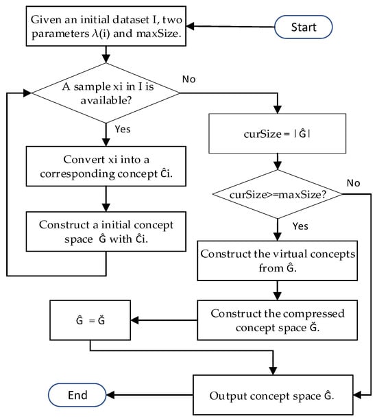 Knowledge storage is the first problem that needs to be solved. Generally, the concept is the basic unit of human cognition, which consists of and , recorded as . is the sample object set, and is the sample attribute set, where xi is a sample and is considered to be mapping in a fuzzy formal context, i.e., where is a power set of B and denotes the set of all fuzzy sets on . Therefore, this article uses concepts as the basic carrier of knowledge, first converting samples into concepts and then forming a concept space through concept clustering, thereby establishing the relationship between concepts and concept spaces. Here, the concept space corresponds to the class t to which the sample belongs. Given an initial dataset I, is the sample space . (.)’ is an induced operator that converts the sample into a concept. The initial concept space formed (denoted by ) is used to store early knowledge and serves as a basis for subsequent concept learning. In addition, to avoid the generation of excessive concept space, a parameter (maxSize) is set to control its size to avoid consuming excessive computing costs and storage space. Therefore, when the sample size of a class is greater than the given maxSize, a virtual concept is generated for the concept space and converted into a compressed concept space (denoted as ).