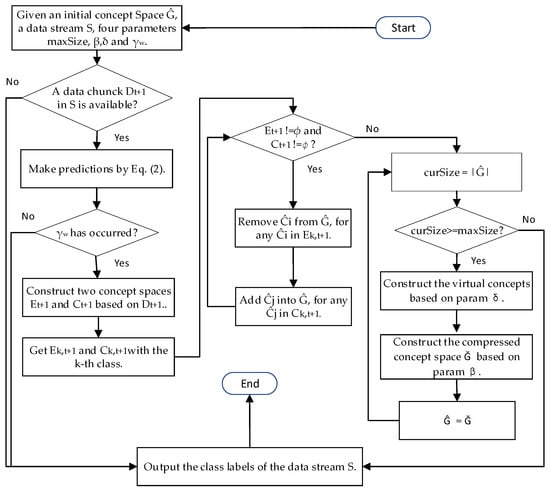 | 1: Input: An initial concept space , a data stream S, four parameters maxSize, , , and . 2: Output: The class labels of the data stream S. 3: while a data chunk Dt+1 in S being available do 4: Make predictions by Equation (5). 5: if the concept warning level has occurred then 6: Construct two concept spaces and based on the data chunk Dt+1. 7: Get and with the k-th class. 8: while ( and )do 9: , for any concept . 10: , for any concept . 11: end while 12: if then 13: Construct the virtual concepts based on the param 14: Construct the compressed concept space based on the param β 15: 16: end if 17: end if 18: end while 19: return the class information. |