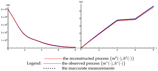 The process () generated by and in the second simulation is shown in Figure 6. In this figure, the blue graph is the “observed” process (). The black dots are the inaccurate measurements of this process. The red graph is the process () generated by the control () (52). The aim of these figures is to show that the reconstructed trajectory of the system remains close to the observed trajectory (see condition 4 (51) in the inverse problem statement).