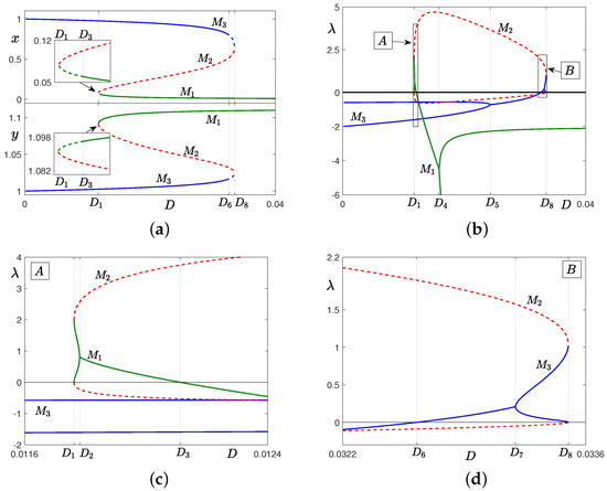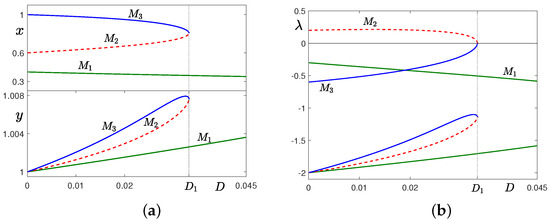 Figure 1 shows the bifurcation diagram and Lyapunov exponents of the equilibria of the model (1) with a change in the parameter D. In the interval (), there are two stable equilibria (green) and (blue), and one saddle equilibrium (red dashed). At the bifurcation point , a saddle-node bifurcation occurs, which means that the two equilibria and collide and disappear. Furthermore, for , only one stable equilibrium exists. In Figure 1b, the Lyapunov exponents show that both stable equilibria are nodes, i.e., both Lyapunov exponents for each equilibria are negative. At the bifurcation point , the Lyapunov exponents for and are equal, which corresponds to the occurrence of the saddle-node bifurcation.