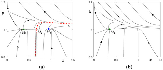 In Figure 2, we show phase portraits of the model (1) for (Figure 2a) and (Figure 2b). In Figure 2a, one can observe a coexistence of two stable nodes (filled green circle) and (filled blue circle). The stable manifold (dashed red line) of the saddle (empty red circle) creates the boundary between the basins of attraction of the two stable equilibria and .