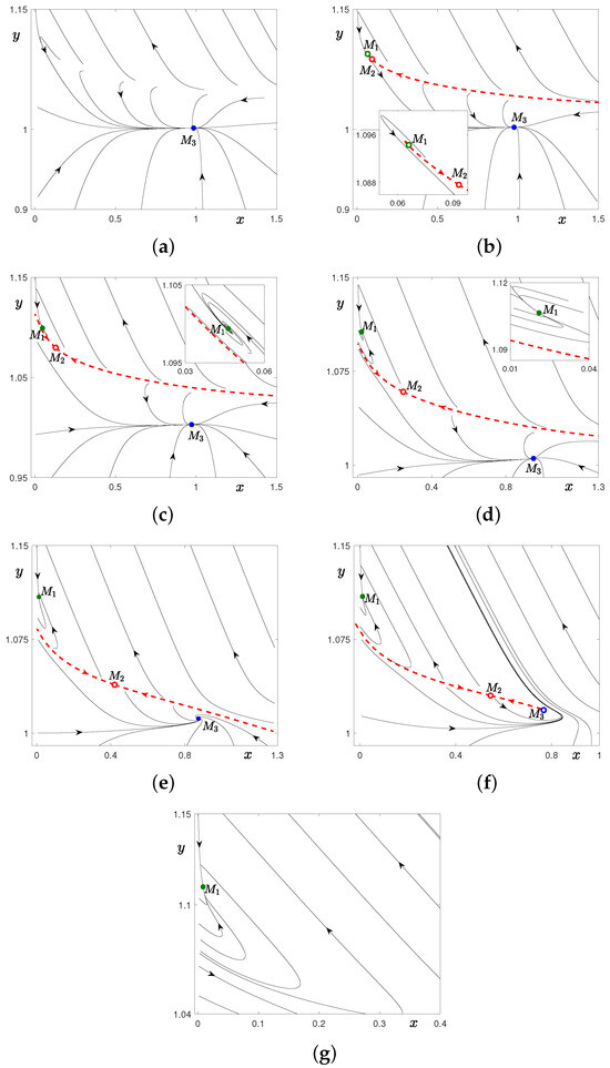 Phase portraits of model (1) with for: (a) , (b) , (c) , (d) , (e) , (f) , and (g) . The equilibria , , and are shown by green, red, and blue, respectively. Here, the separatrix shown by a red dashed line is the stable manifold of the saddle . Arrows show evolution over time.