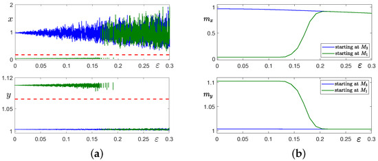 System (1) with , : (a) coordinates, x (top) and y (bottom), of the equilibria (green), (red dashed), and (blue). Here, and are stable nodes and is a saddle. In (b), the Lyapunov exponents are shown by the corresponding colors.
