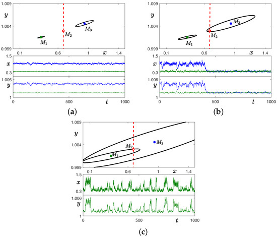 The relative position of the confidence ellipses and the boundary of the basin of attraction of a deterministic attractor makes it possible to describe noise-induced transitions. Figure 7 demonstrates an application of this method. For the noise intensity in Figure 7a (top), confidence ellipses (black) for both equilibria lie far from the separatrix (red dashed line) between the basins of attraction of the equilibria and . This means that random states are localized near or , and transitions do not occur. This behavior is shown by the time series in Figure 7a (bottom).