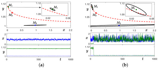 Now, we consider stochastic system (3) with , in the bistable parameter region where the initial deterministic model exhibits a coexistence of two stable equilibria and (see Figure 3a). Figure 6a shows the x- and y-coordinates of the random states of the stochastic solutions starting at (green) and (blue) versus noise intensity for . First, as the noise increases, the dispersion of random states around both equilibria increases as well. For noise intensity , solutions starting at (green) demonstrate transitions to . In Figure 6b, these transitions are shown in terms of the mean values of the stochastic states. For noise intensity , the two mean values differ, but with further increases in , the mean values of the random states of the stochastic solutions starting at (green) rapidly increase and merge with the mean values for (blue). After this merging, both mean values slowly decrease. It is worth noting that in this case, only one-way noise-induced transitions are observed.