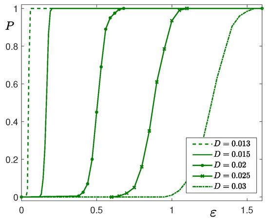 The results of the statistical analysis in terms of the probability P of transitions are given in Figure 9 versus noise intensity for various values of the parameter D (the color matches the equilibrium from which we observe the transition). Here, we use the x-coordinate of the equilibrium as a threshold value. First, transitions from equilibria occur for higher levels of noise intensity . Second, for both equilibria, the following remark holds: the larger the value of D, the higher the required noise intensity for transitions.