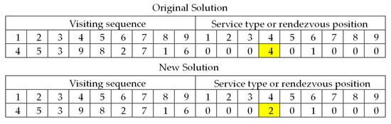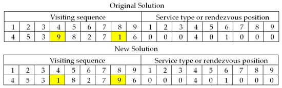 Let  represent the current solution, and  denote the set of solutions in the neighborhood of .  is generated by either one of the swap, insertion, inversion, and change in service type operators. The swap operator switches the positions of two randomly selected elements in the first part of . The insertion operator inserts a random element immediately before another random element in the first part of  The inversion operator reverses the order of a random substring in the first part of  The change of service type operator randomly chooses an element in the second part of  and changes its value at random (between 0 and ). The four operators are illustrated in Figure 4, Figure 5, Figure 6 and Figure 7. The probabilities of performing the swap, insertion, inversion, and change in the service type operators are fixed at 0.25, 0.25, 0.25, and 0.25, respectively.