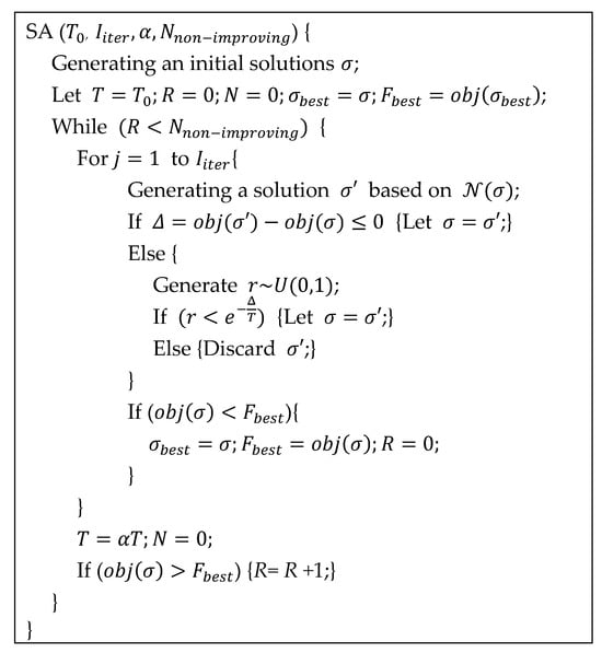 Initially,  stands as the present temperature  and  is the random initial solution.  consists of a random service sequence of  customers and  service types.  represents the current best solution and  denotes the current best objective function value, . The objective function is the completion time. The calculation of the completion time can be referred to as the MILP of the FSTSP as proposed by Murray and Chu []. The algorithm searches the neighborhood of , , to obtain a new solution  with the objective function value . Let  be the change in the objective function value. If  (i.e.,  is better than ), then  is replaced by . Otherwise, the algorithm replaces  by  with the probability . The best solution obtained so far and its objective function value,  and , are continuously updated as the algorithm proceeds.