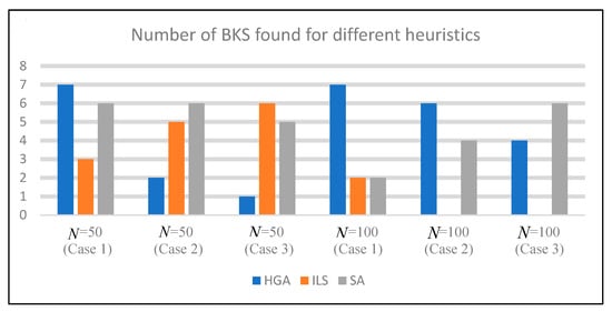 We further analyze the number of BKSs found by HGA, ILS, and SA for the second FSTSP. The number of customers is set to be N = 50 and N = 100, and three cases of customer locations are analyzed. The locations are generated at random in a square region of 100 km2, 500 km2, and 1000 km2 for Case 1, Case 2, and Case 3, respectively. As shown in Figure 9, ILS performs the best only for N = 50 (Case 3), while SA performs the best for N = 50 (Case 2) and N = 100 (Case 3). HGA performs the best for N = 50 (Case 1), N = 100 (Case 1), and N = 100 (Case 2). Overall, SA can obtain the largest number of BKSs among the three heuristics.