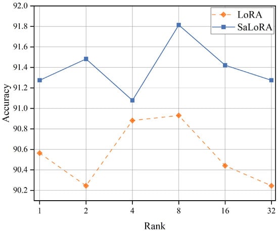 The Effect of Rank r. Figure 4 illustrates the experimental results of fine-tuning RoBERTa-large across different ranks. We see that the rank r significantly influenced the model’s performance. Both large and small values of r led to suboptimal results. This observation emphasizes that selecting the optimal value for r through heuristic approaches is not always feasible. Notably, SaLoRA consistently improved performance across all ranks when compared with the baseline LoRA. This suggests that SaLoRA effectively captured the “intrinsic rank” of the incremental matrix.