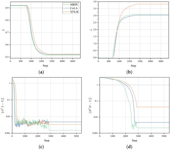 Visualization of Four Components. We plotted the visualization of expected sparsity , the Lagrangian multiplier and and to show whether these four components were regularized by Lagrangian relaxation and orthogonal regularization, respectively. Specifically, we fine-tuned the RoBERTa-base using SaLoRA on the CoLA, STS-B and MRPC datasets. The initial Lagrangian multiplier was 0 and the target sparsity b was 0.5. From Figure 6, we see that: