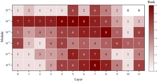 The resulting rank of each incremental matrix obtained from fine-tuning RoBERTa-base on MRPC with SaLoRA. The initial rank is set at 8, and the target sparsity is 0.5. The x-axis is the layer index and the y-axis represents different types of modules.