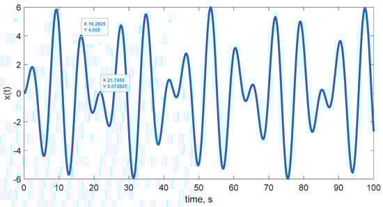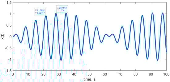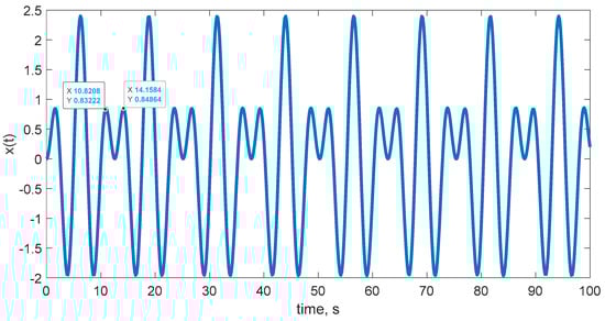 Thus, Table 4 presents the values of the period () obtained by simulating the analytical solution, Equation (2). In particular, the period was calculated as the average of the distances between two consecutive maxima on the time axis, as shown in the representations of the solutions from the simulation in Figure 2, Figure 3 and Figure 4.