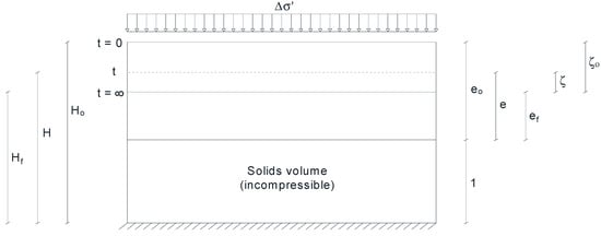 For the study of the nonlinear consolidation of soils, in recent years, there have been studies on different types of dependence between the void ratio (related to the porosity) and effective stress on the one hand, and hydraulic conductivity and effective stress (or void ratio), on the other. Thus, we highlight the models of Davis and Raymond [], Juárez-Badillo [], and Cornetti and Battaglio [], the latter of which was reformulated by Arnod et al. []. Among the assumptions made using these models are the incompressibility of the fluid and soil skeleton, a constant volume (1 + e) in the soil compression term in the equilibrium equation and the lack of consideration of creep effects. The most widely used model in the literature, that of Cornetti and Battaglio [], assumes logarithmic dependencies between both the void ratio and effective stress , and between the void ratio and hydraulic conductivity . These dependencies are commonly known as soil-constitutive relationships.