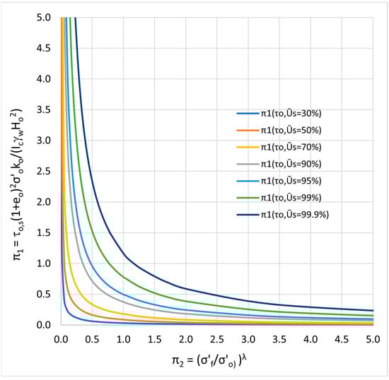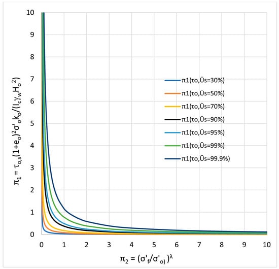 Thus, in Figure 6, each of the seven curves depicted provides the (characteristic) time for which a given soil (whose properties reside in the expressions of the monomials and ) reaches a certain degree of settlement. In other words, is the time it takes for the soil to reach an average settlement degree of 70% ().