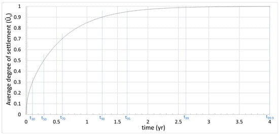 Average degree of settlement evolution for the proposed real case, with determination of the times associated with different percentages (or degrees) of settlement: 30%, 50%, 70%, 90%, 95%, 99%, and 99.9% (0.3, 0.5, 0.7, 0.9, 0.95, 0.99, and 0.999).