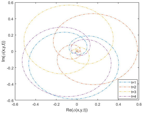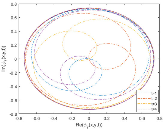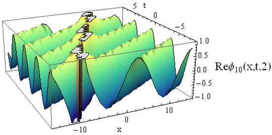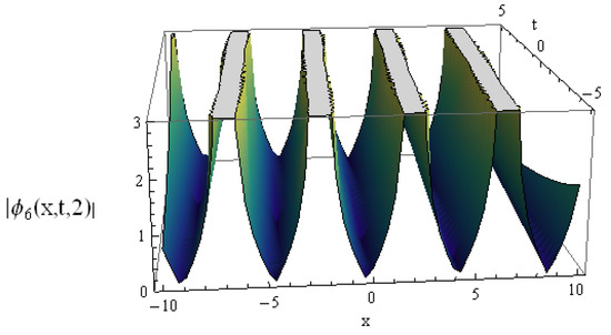 In being devoid of random impacts, the enormous significance of the numerous solitary properties of the investigated solutions must be examined. For example, Equation (9) provides breathers structures, and stationary and super solitons, as shown in Figure 7 and Figure 8. The solution (11) produces two wave structure types; the first type is a bright explosive envelope wave and the second is an explosive solitonic form, as depicted in Figure 9 and Figure 10.