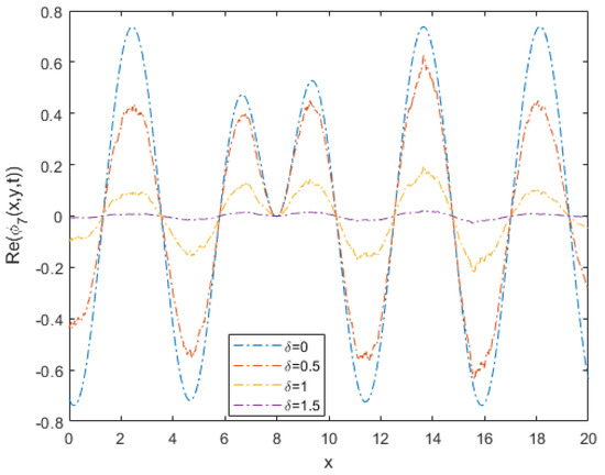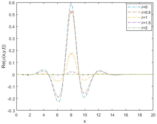 Here, and represent the wave numbers in x and y directions, is phase constant of soliton, represents the noise amplitude, and identifies wave speed, whereas and denote the inverse width of the soliton along the x- and y-directions and v denotes the soliton velocity. Equation (1) becomes